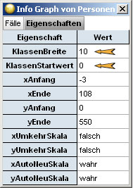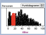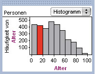 Bei dem Histogramm rechts wurde im Eigenschaftsfenster eine Klassenbreite von 10 Jahren gewählt mit Startwert bei 0 Jahren.